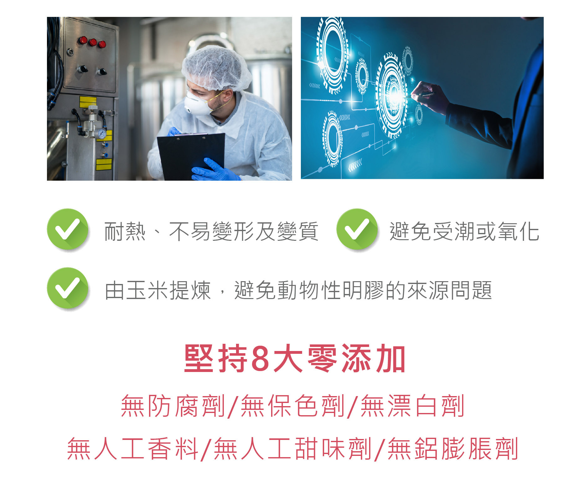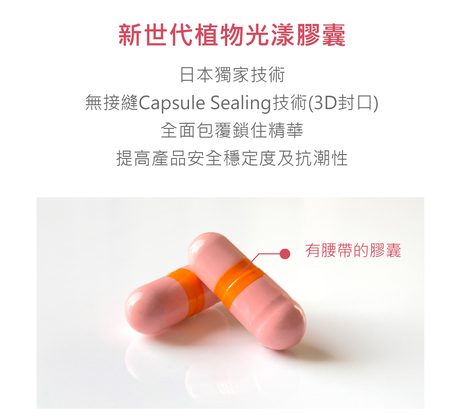 • 植物光漾膠囊殼:羥丙基甲基纖維素、純水、鹿角菜膠、二氧化鈦、氯化鉀、食用紅色六號、食用黃色五號