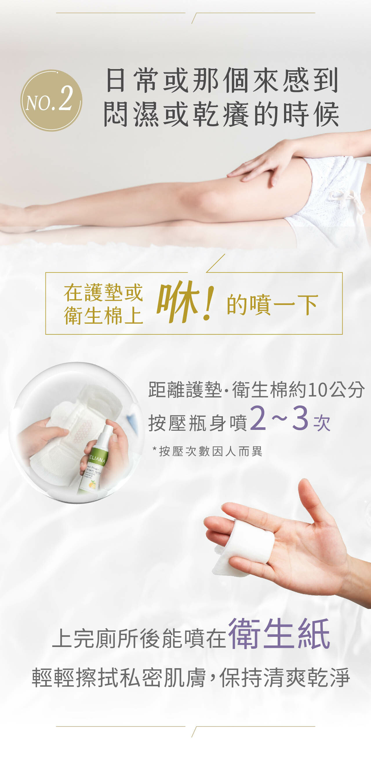 後即可穿上內褲, 也可噴於護墊、內褲上。生理期、