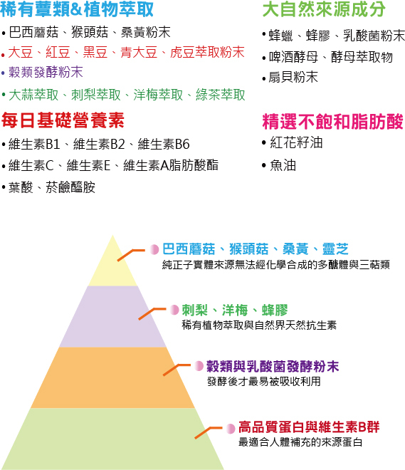 ♦ 成份 : 巴西蘑菇、猴頭菇、桑黃萃取物粉末、紅花籽油、魚油、蜂蠟、大豆、紅豆、黑豆、青大豆、虎豆萃取物粉末(曾獲得八國專利之豆類萃取物)、大蒜、蜂膠、刺梨萃取物粉末、濃縮洋梅、穀類發酵粉末、乳酸菌粉末、綠茶粉末、扇貝粉末、啤酒酵母、酵母萃取物粉末、維生素B1、B2、B6、E(抗氧化劑)、A、葉酸、菸鹼醯胺等。新添加成分:紅酒、褐藻、玄米萃取物。