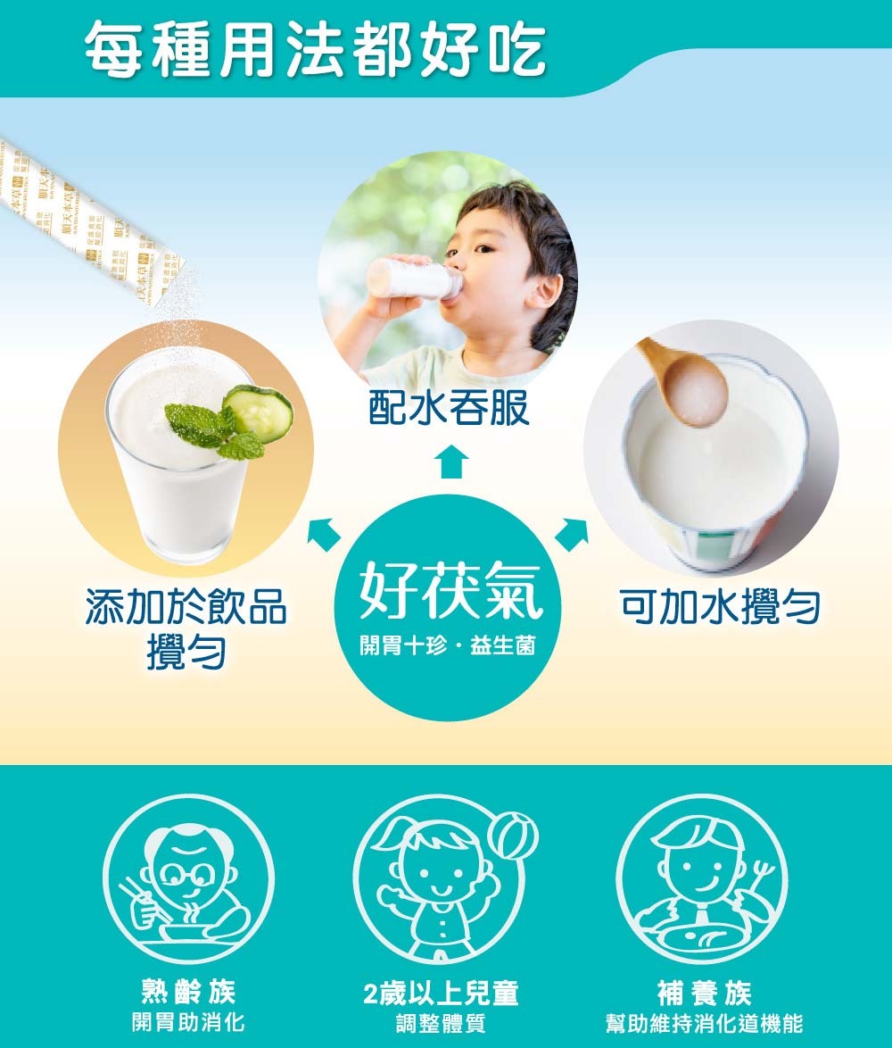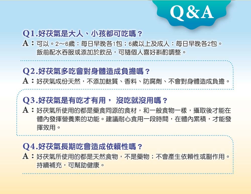 6歲以上及成人:每日早晚各2包 飯前配水吞服或添加於飲品,可隨個人喜好斟酌調整。