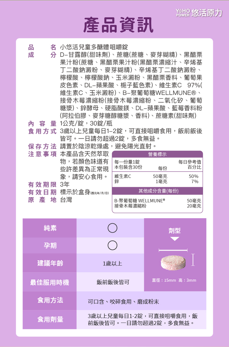 ・食用方式: 1-3歲-每日使用1錠;4歲以上-每日規律2錠