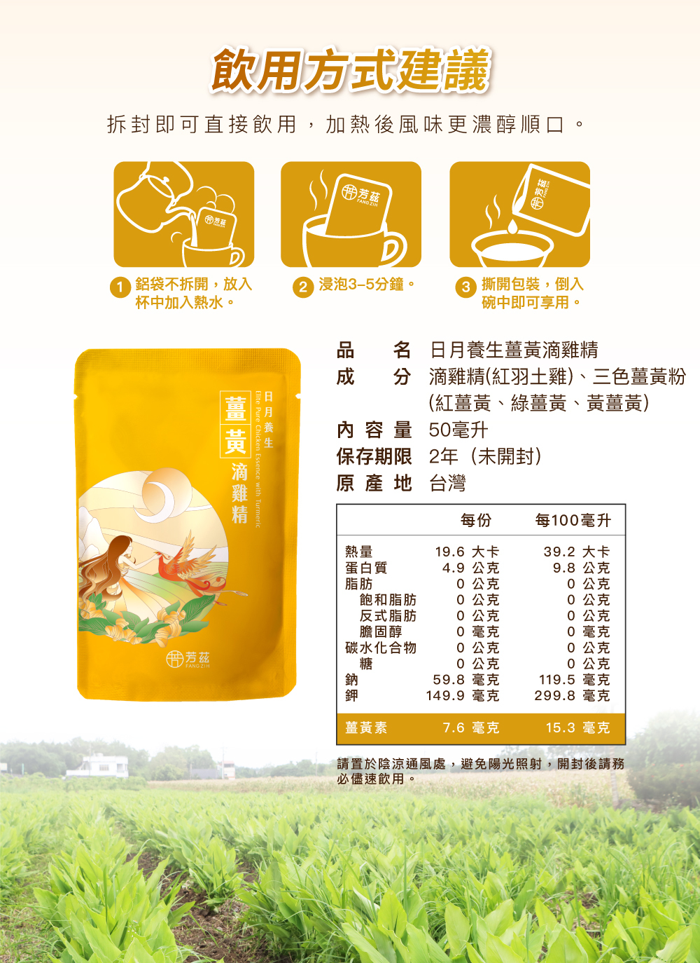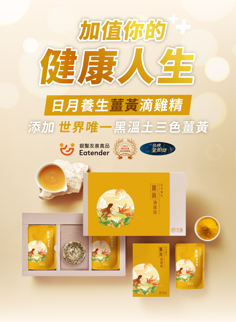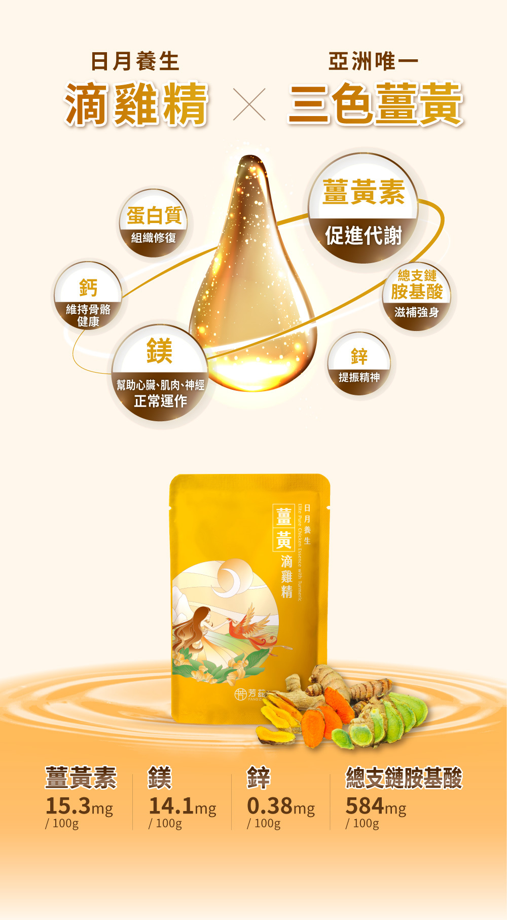 .「日月養生滴雞精」結合「雙有機認證薑黃粉」,
